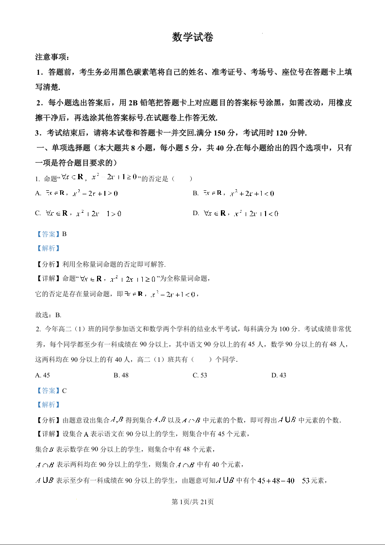 重庆市巴蜀中学2025届高考适应性月考卷(一)数学试题(解析版)