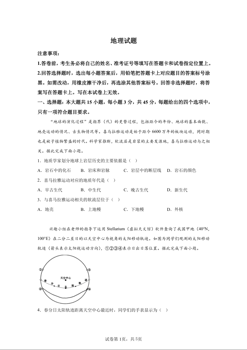 重庆市巴蜀中学2025届高考适应性月考卷(一)地理