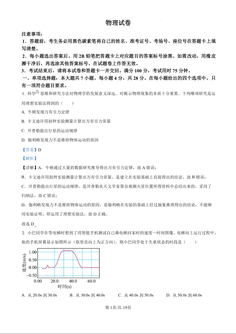 重庆市巴蜀中学2025届高考适应性月考卷(一)物理试题(解析版)