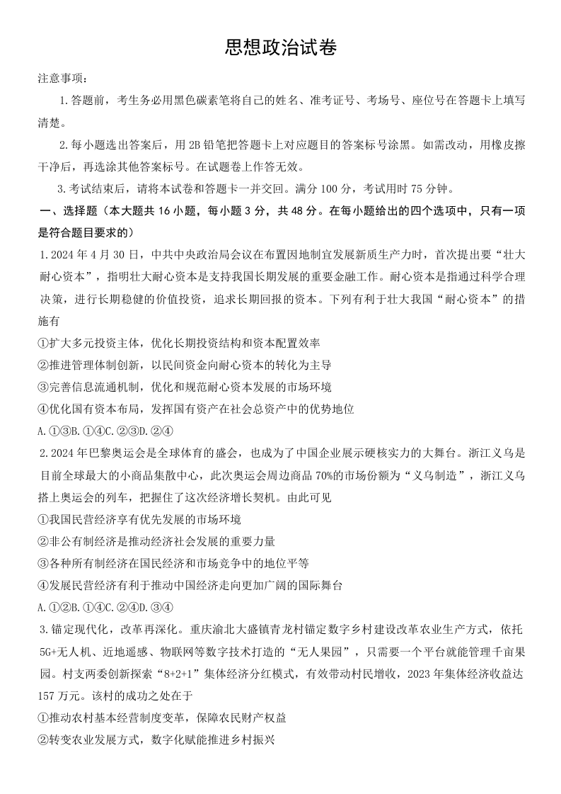 重庆市巴蜀中学2025届高考适应性月考卷(一)政治