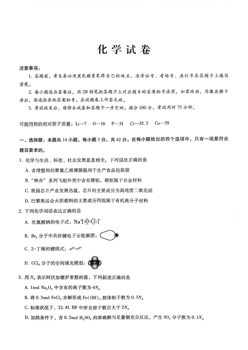 重庆市第八中学2025届高考适应性月考卷(一)化学试卷