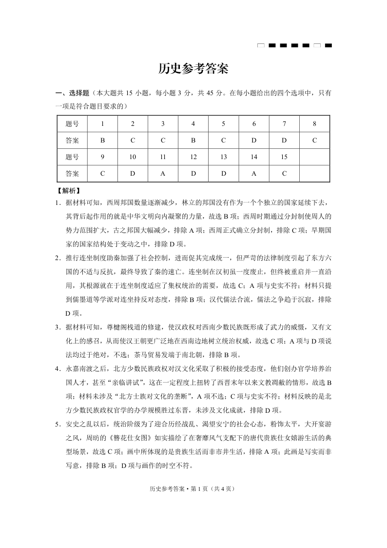 重庆市第八中学2025届高考适应性月考卷(一)历史答案