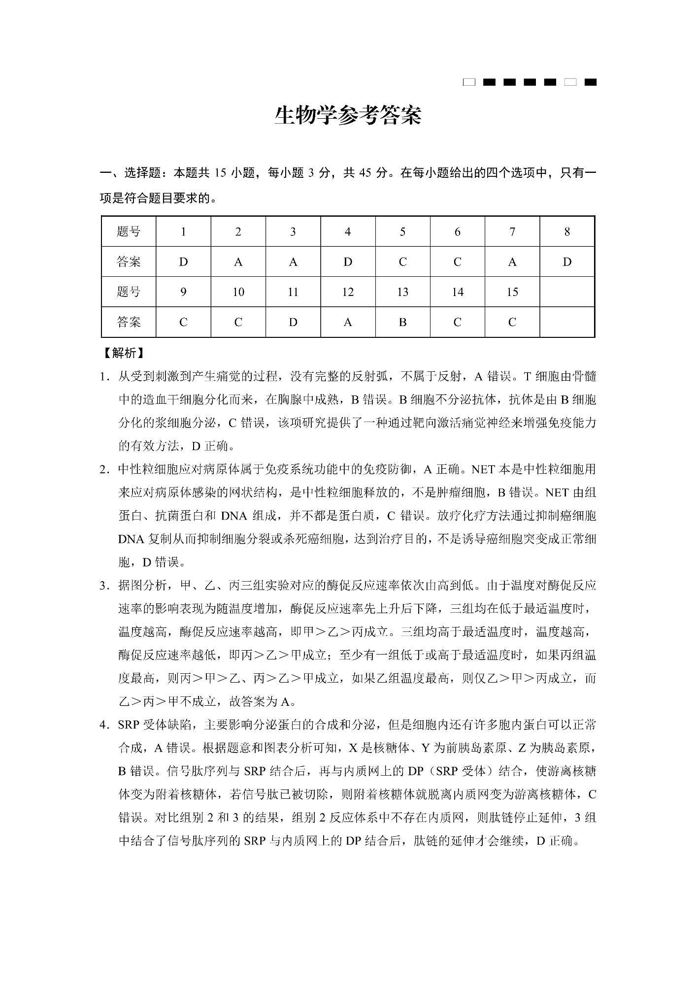 重庆市第八中学2025届高考适应性月考卷(一)生物答案