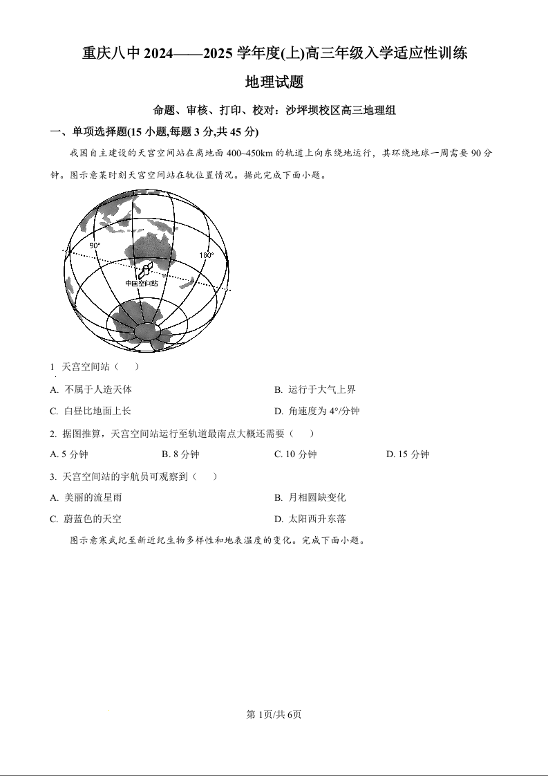 重庆市第八中学校2024-2025学年度(上)高三年级入学适应性训练地理试题(原卷版)