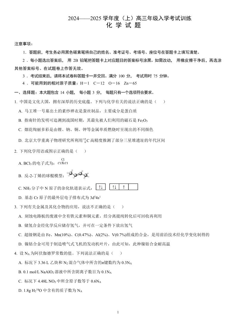 重庆市第八中学校2024-2025学年度(上)高三年级入学适应性训练化学+答案