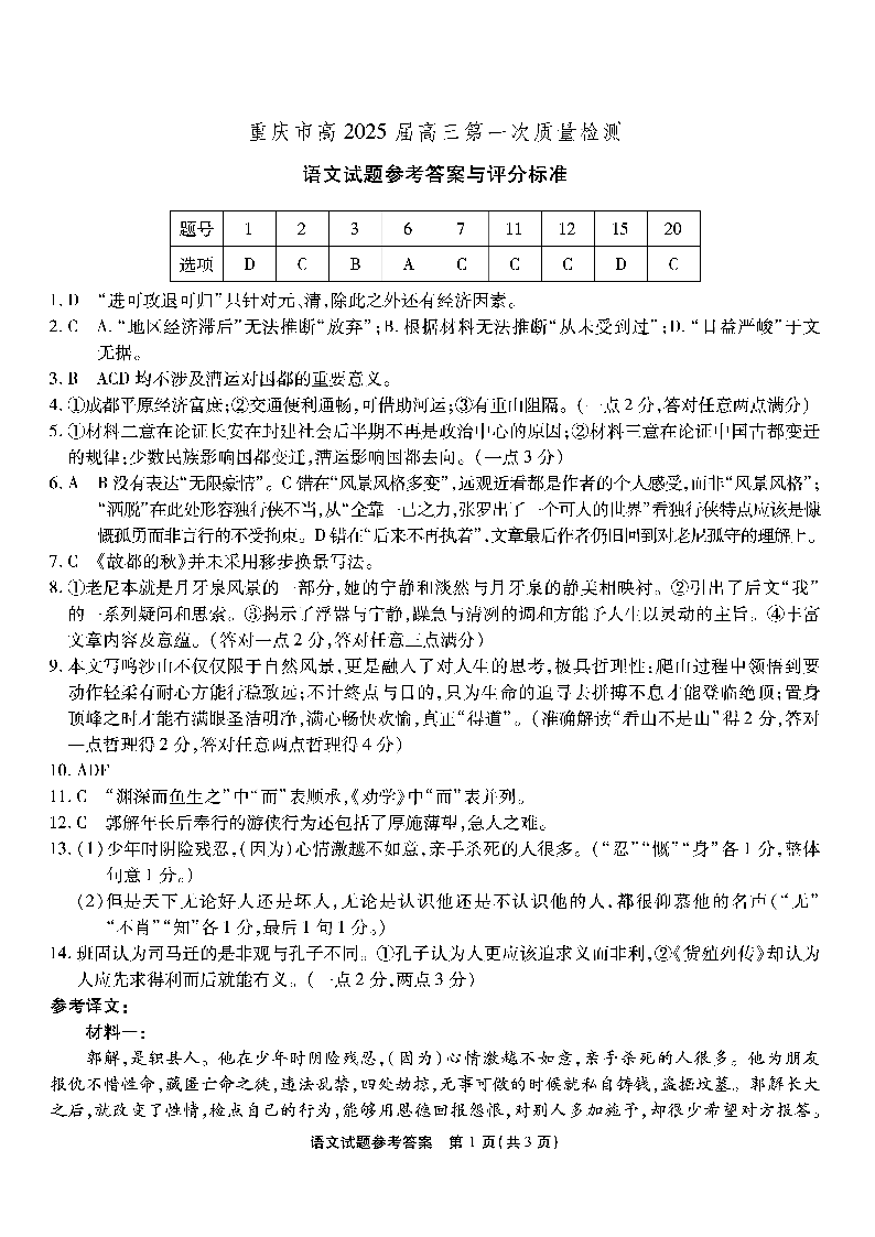 重庆市南开中学2025届高三第一次质量检测语文答案