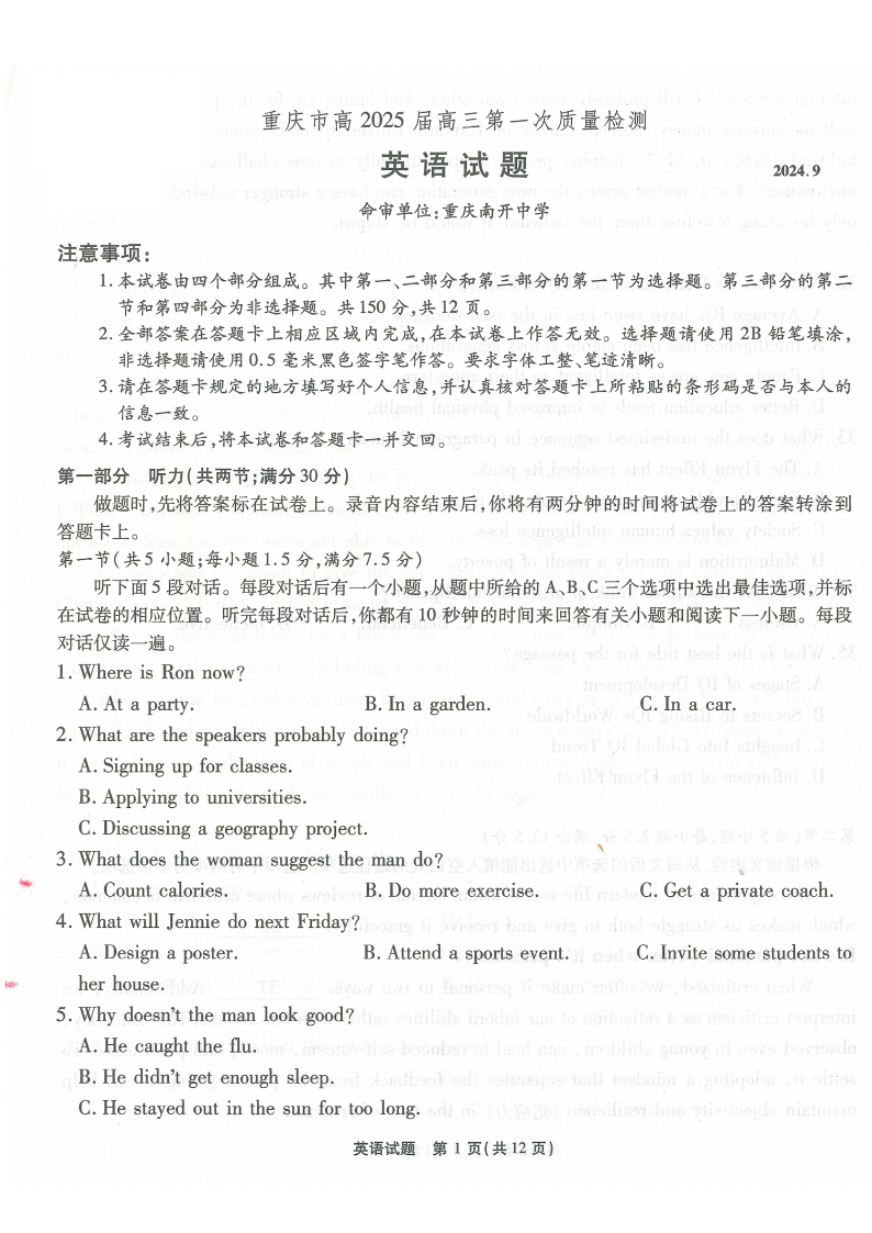 重庆市南开中学2025届高三第一次质量检测英语