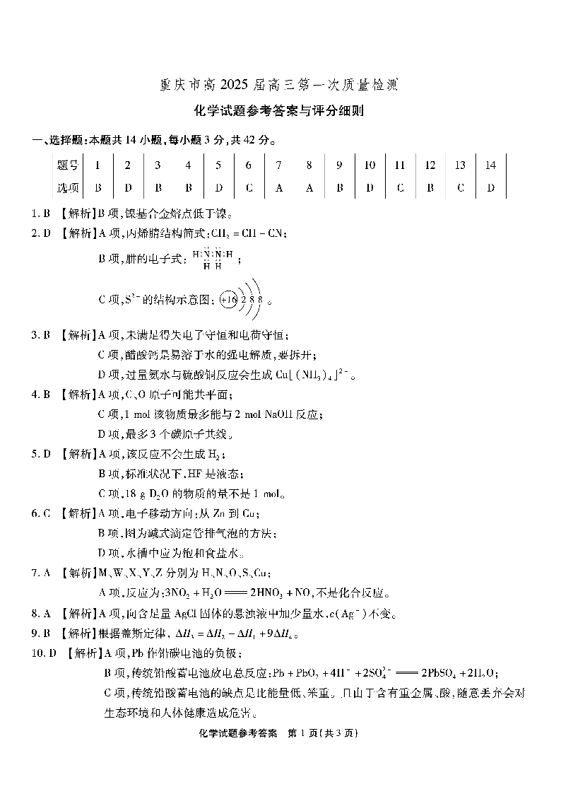 重庆市南开中学2025届高三第一次质量检测化学答案