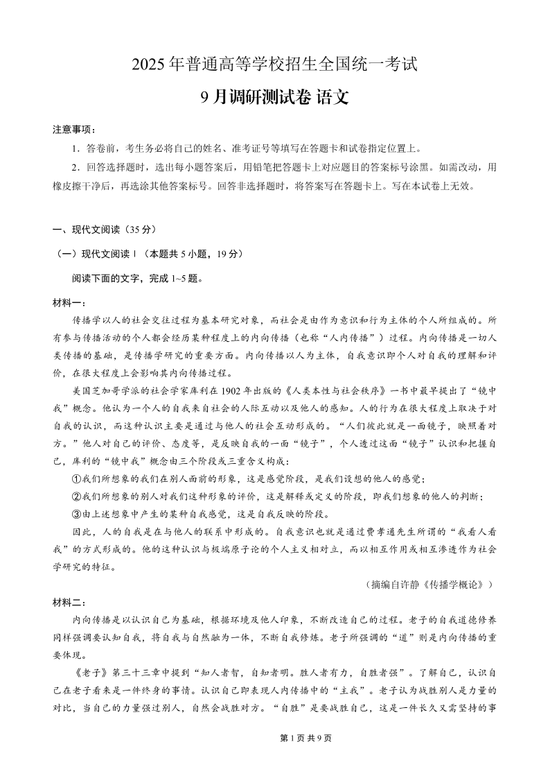 重庆康德2025年普通高中学业水平选择性考试9月调研测试卷语文