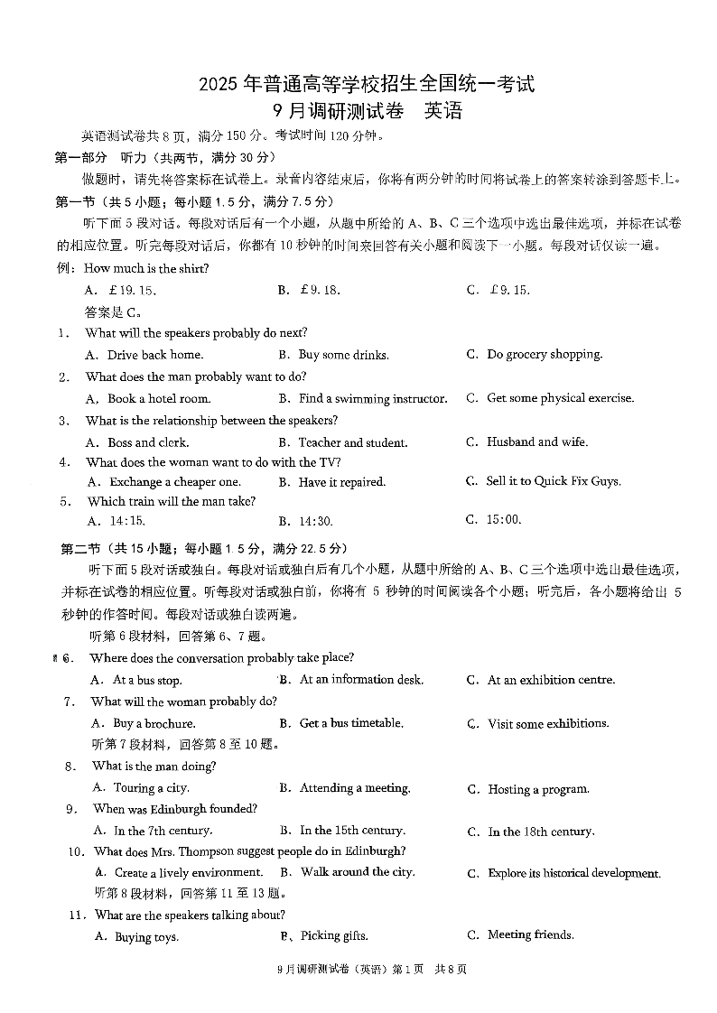 重庆康德2025年普通高中学业水平选择性考试9月调研测试卷英语