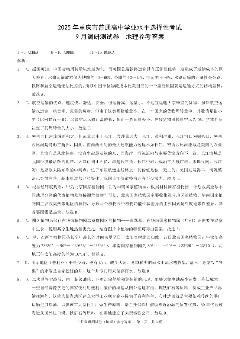 重庆康德2025年普通高中学业水平选择性考试9月调研测试卷地理答案