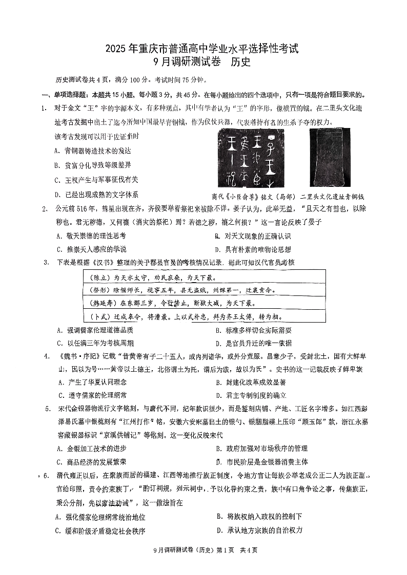 重庆康德2025年普通高中学业水平选择性考试9月调研测试卷历史