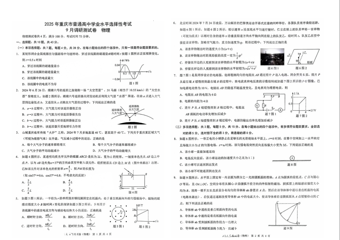 重庆康德2025年普通高中学业水平选择性考试9月调研测试卷物理