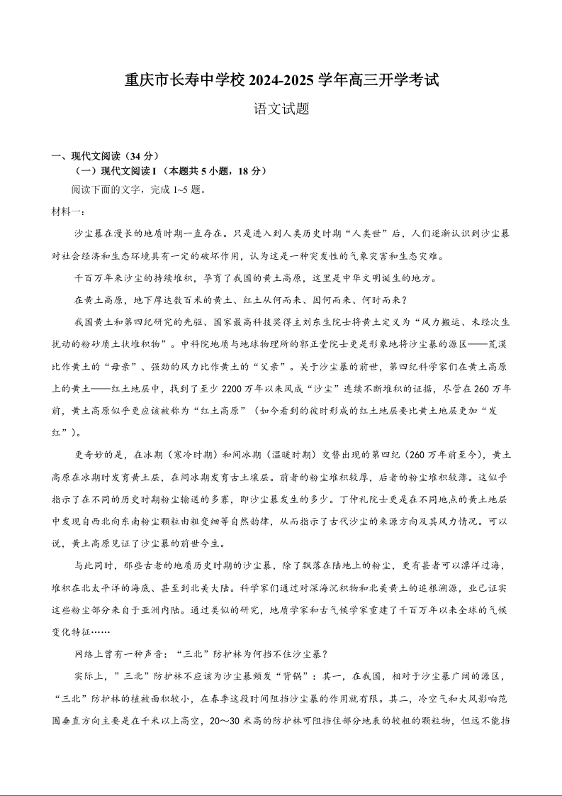 重庆市长寿中学校2024-2025学年高三开学考试语文+答案