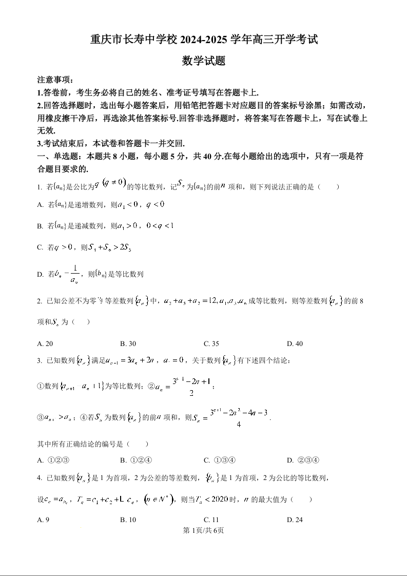 重庆市长寿中学校2024-2025学年高三开学考试数学试题(原卷版)
