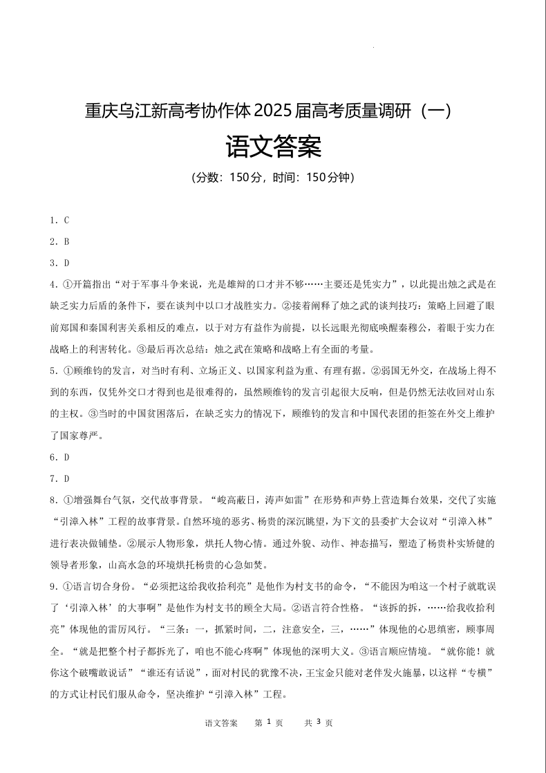重庆市重庆乌江新高考协作体2025届高考质量调研(一)语文答案