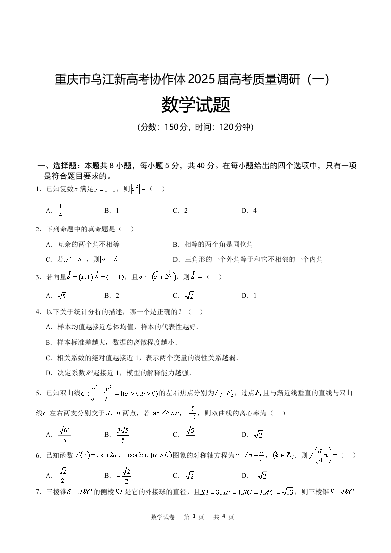 重庆市重庆乌江新高考协作体2025届高考质量调研(一)数学