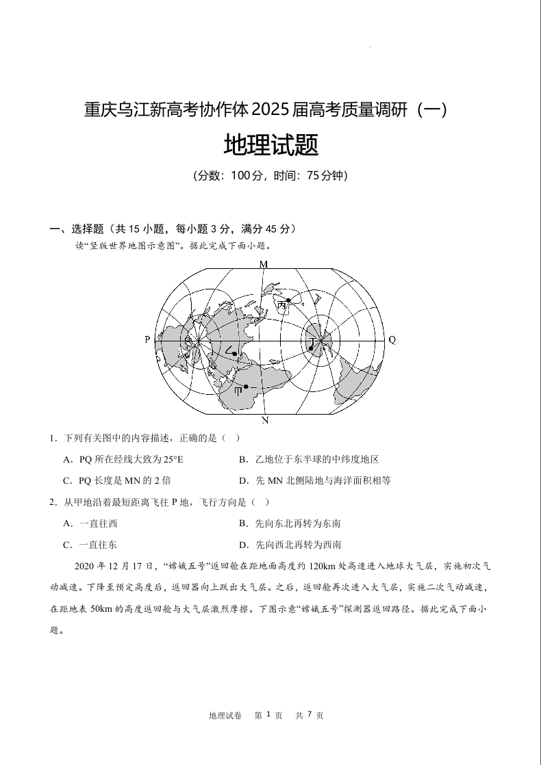 重庆市重庆乌江新高考协作体2025届高考质量调研(一)地理