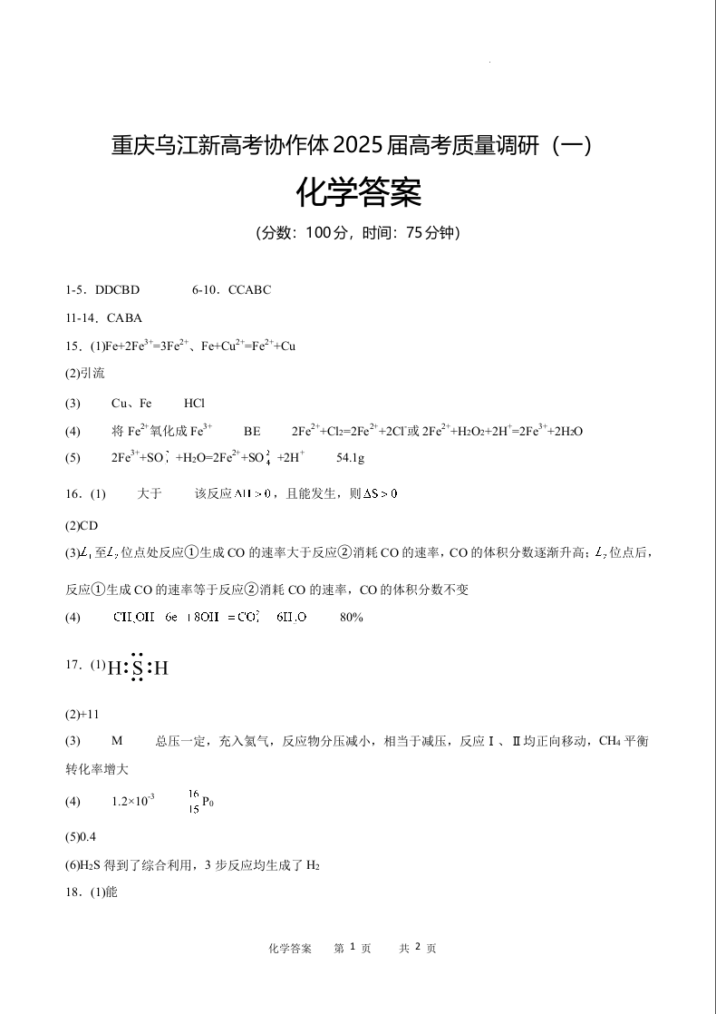 重庆市重庆乌江新高考协作体2025届高考质量调研(一)化学答案