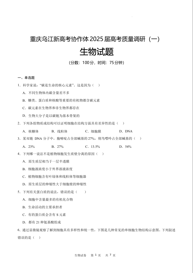 重庆市重庆乌江新高考协作体2025届高考质量调研(一)生物