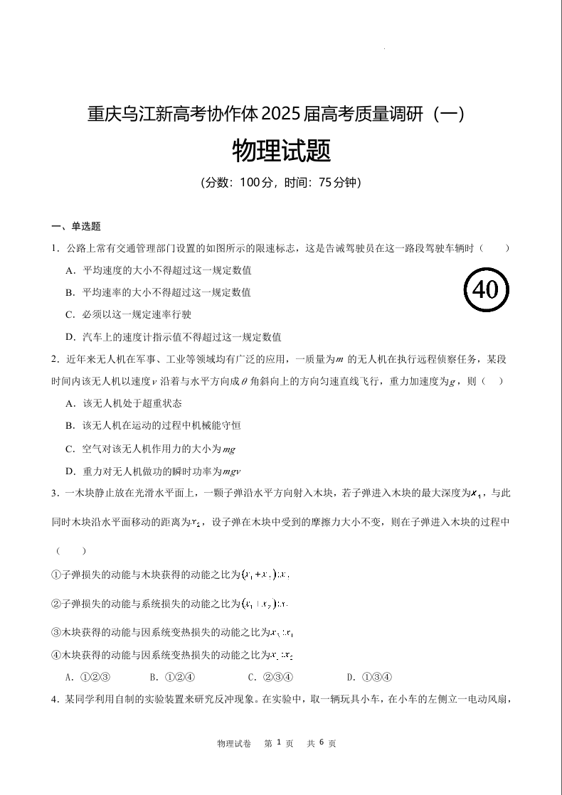 重庆市重庆乌江新高考协作体2025届高考质量调研(一)物理