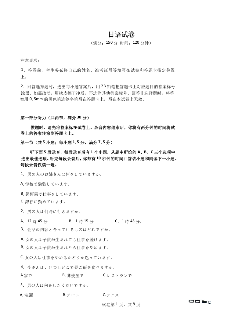 贵州省贵阳市第一中学2025届高三上学期适应性月考(一)日语