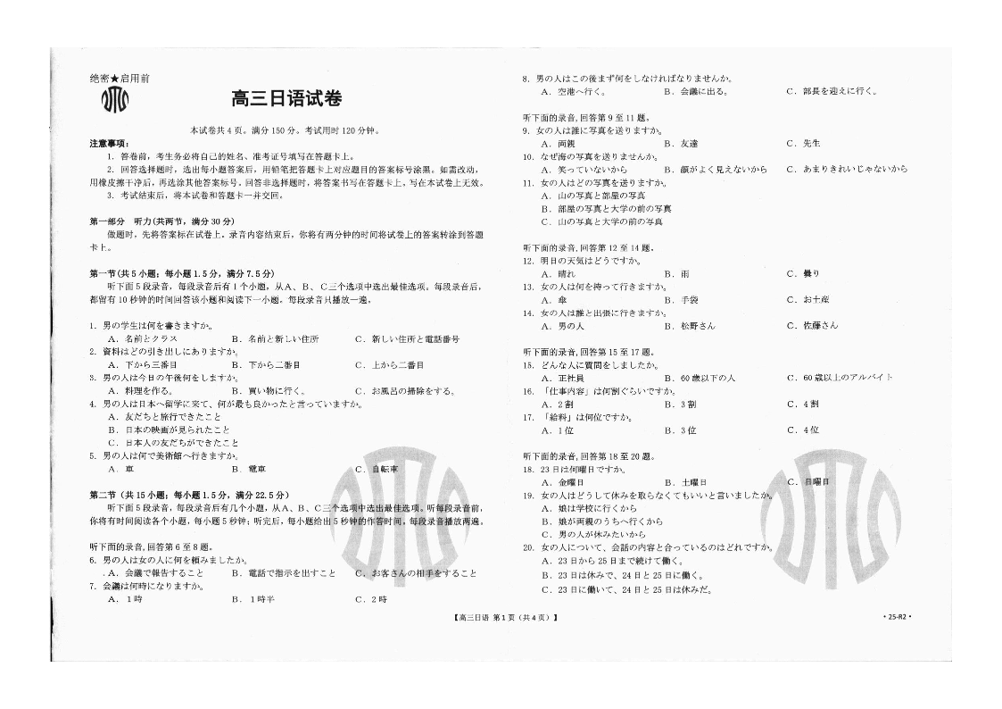 吉林省部分高中2025届高三9月联考日语