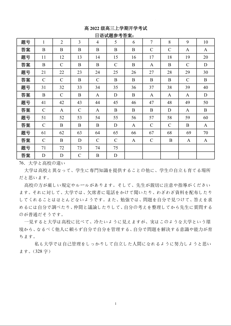 四川省泸州市叙永第一中学校高2022级高三上学期开学考试日语答案