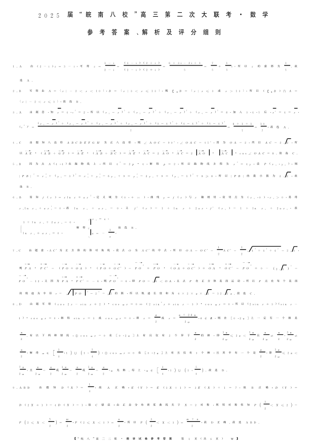 安徽省皖南八校2025届高三第二次大联考数学答案