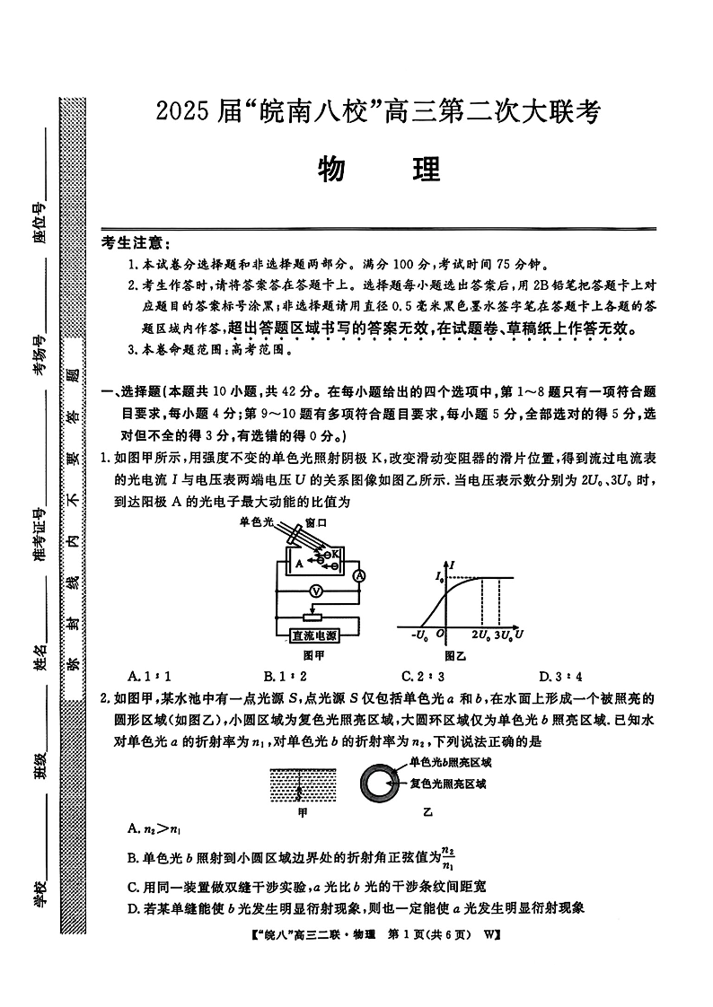 安徽省皖南八校2025届高三第二次大联考物理+答案