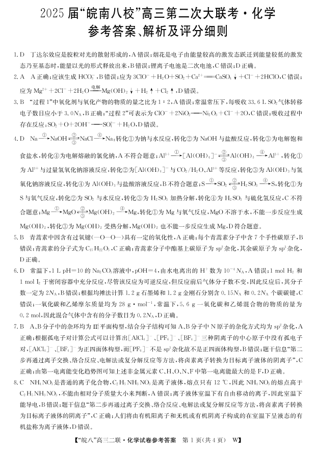安徽省皖南八校2025届高三第二次大联考化学答案