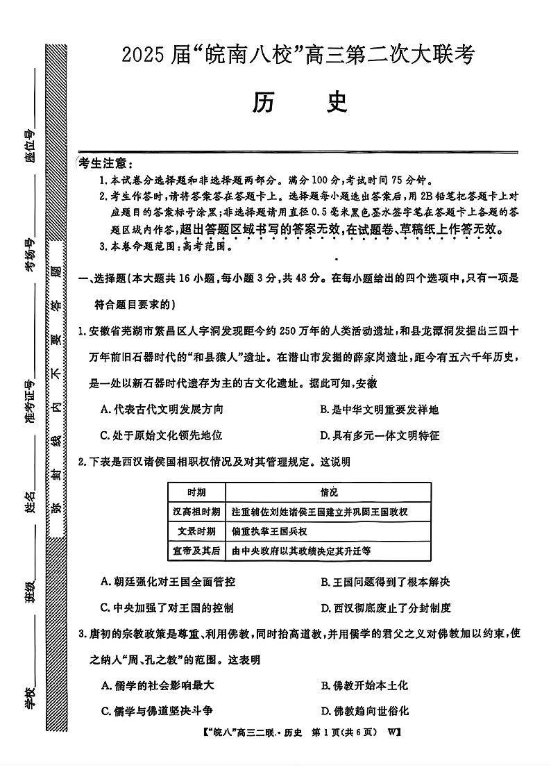 安徽省皖南八校2025届高三第二次大联考历史+答案