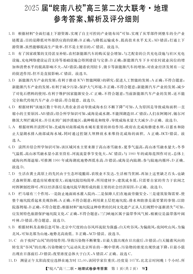 安徽省皖南八校2025届高三第二次大联考地理答案