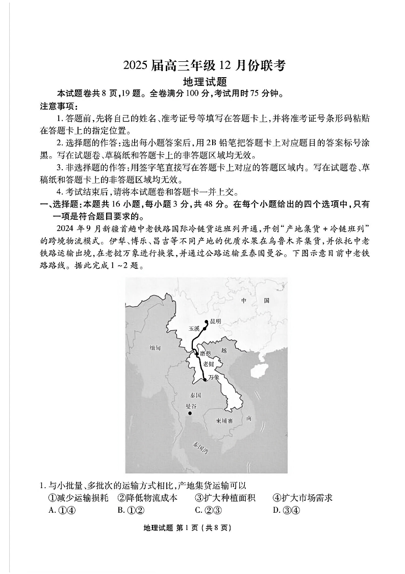 广东省区域高中2025届高三上学期12月联考地理+答案