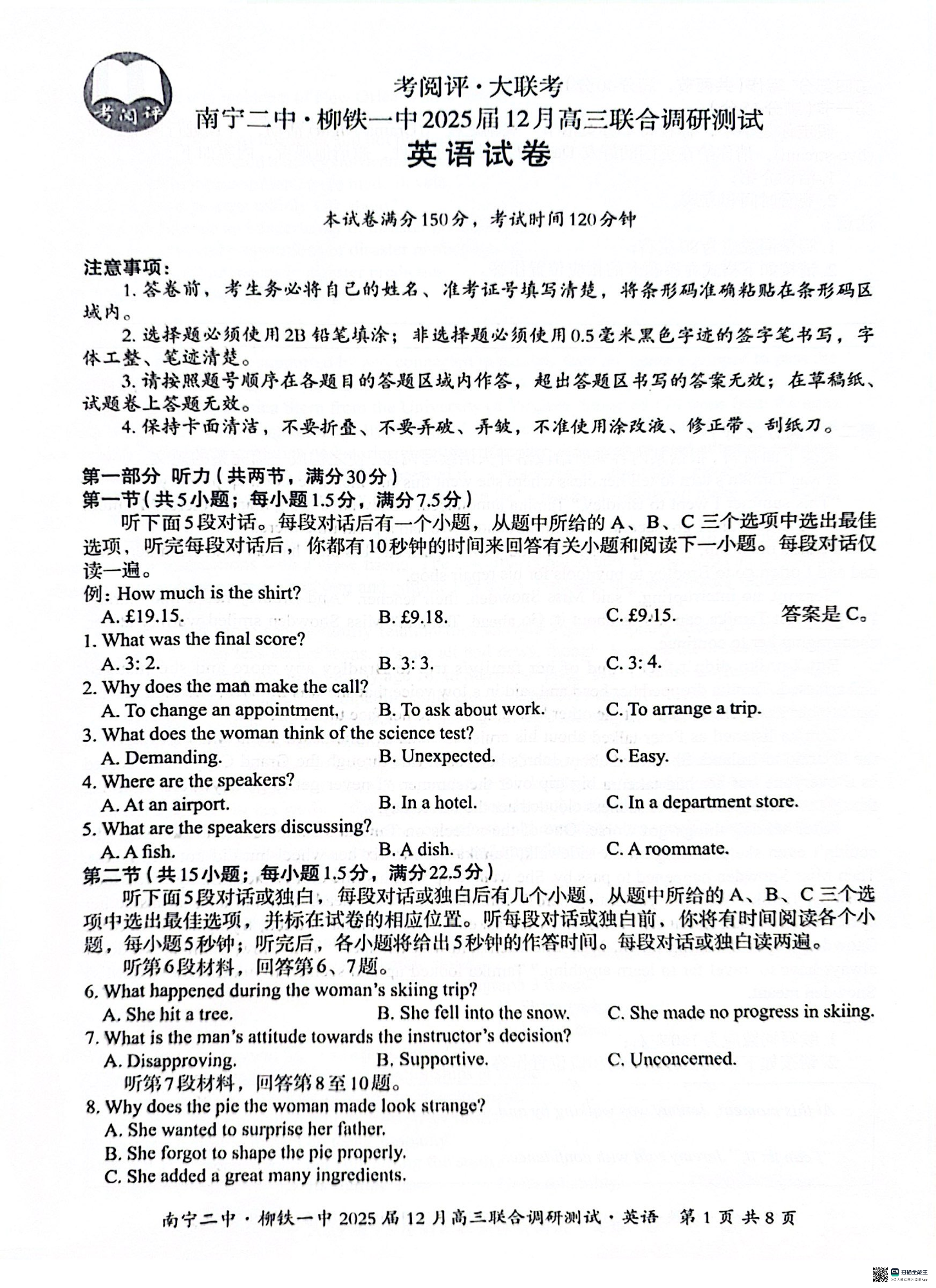 广西省考阅评•大联考南宁二中•柳铁一中2025届12月高三联合调研测试英语