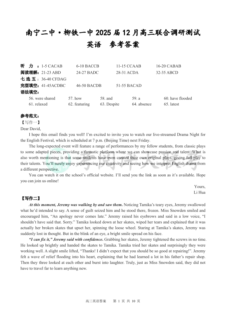 广西省考阅评•大联考南宁二中•柳铁一中2025届12月高三联合调研测试英语答案