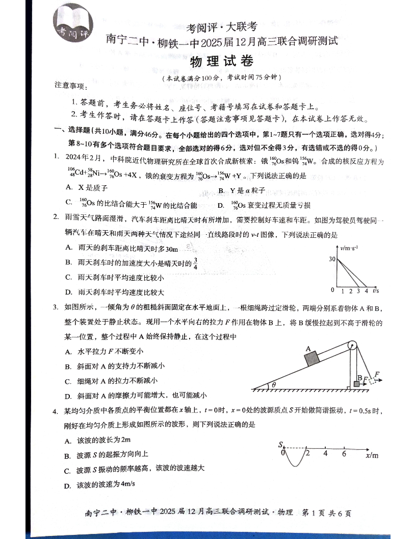 广西省考阅评•大联考南宁二中•柳铁一中2025届12月高三联合调研测试物理