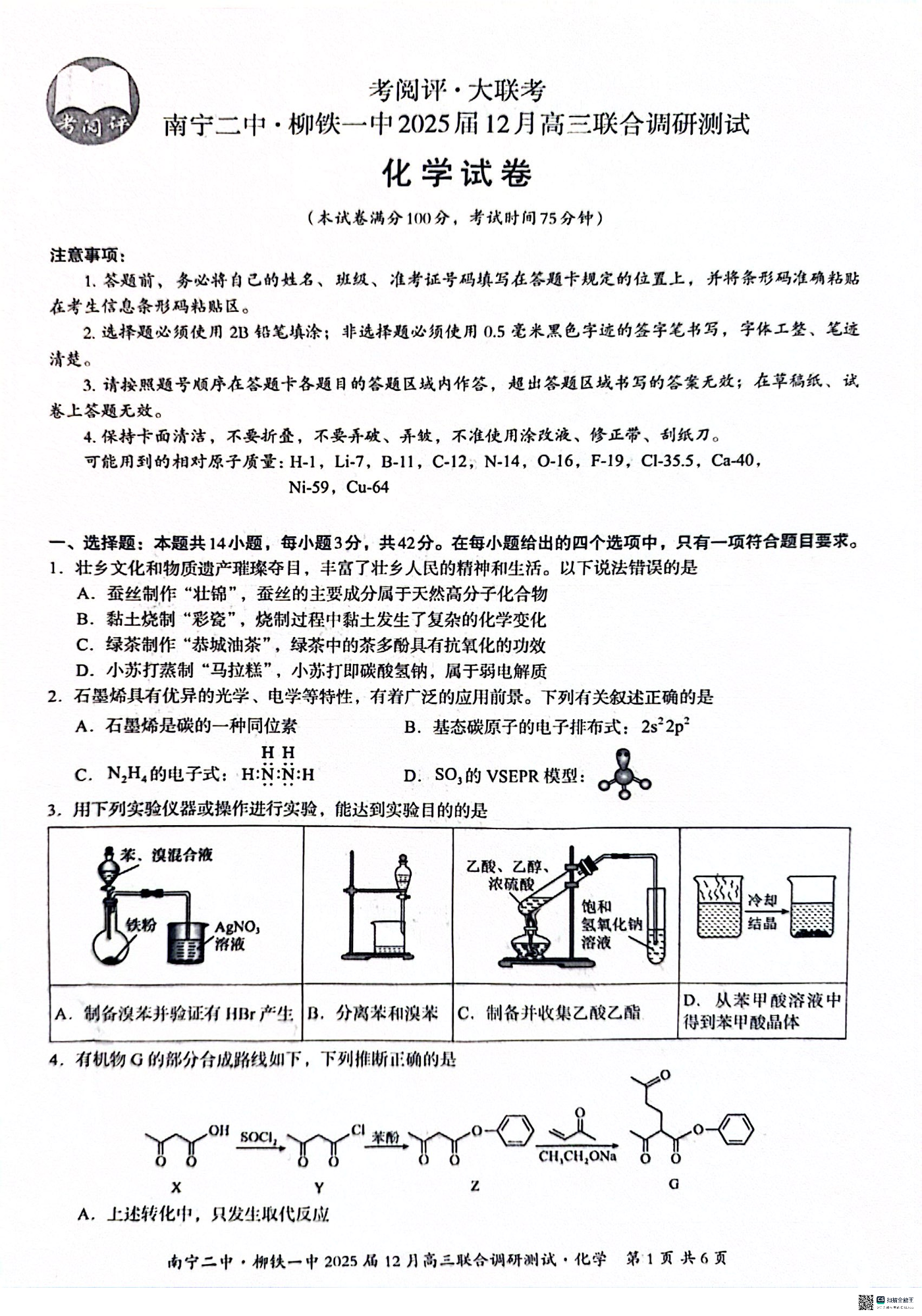 广西省考阅评•大联考南宁二中•柳铁一中2025届12月高三联合调研测试化学