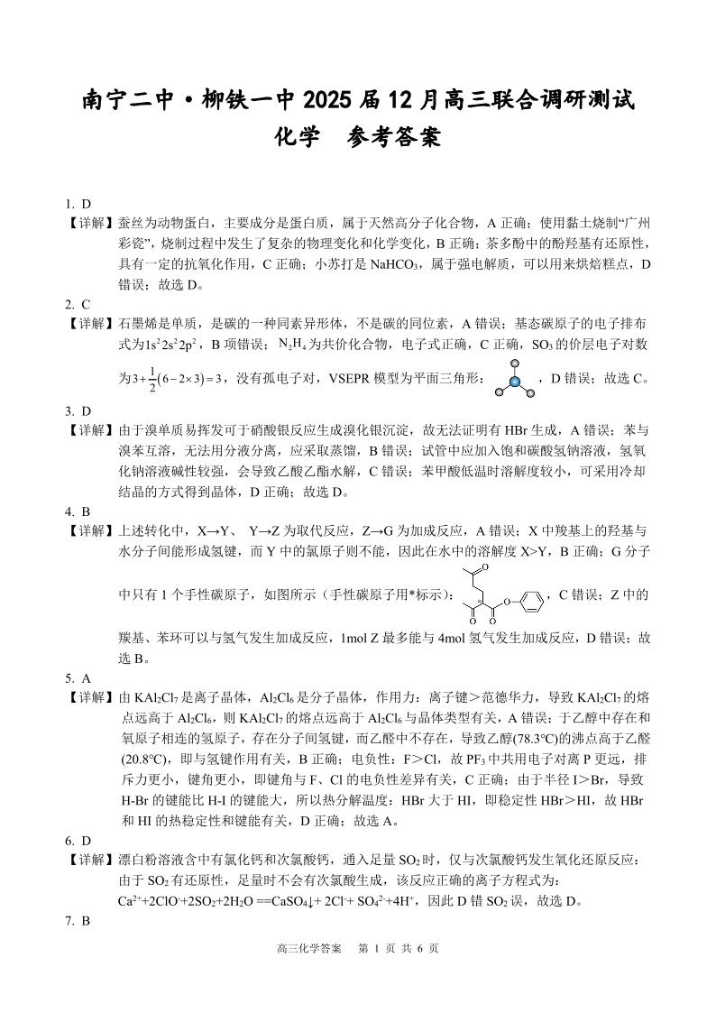 广西省考阅评•大联考南宁二中•柳铁一中2025届12月高三联合调研测试化学答案