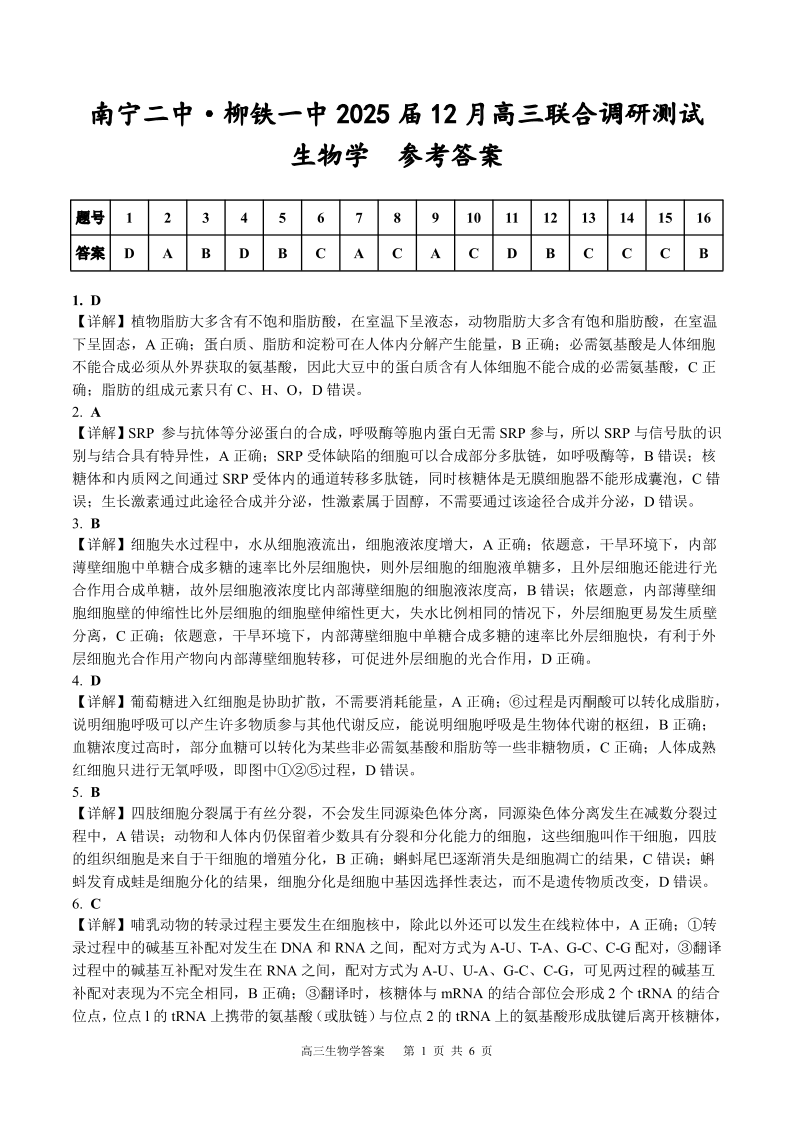 广西省考阅评•大联考南宁二中•柳铁一中2025届12月高三联合调研测试生物答案