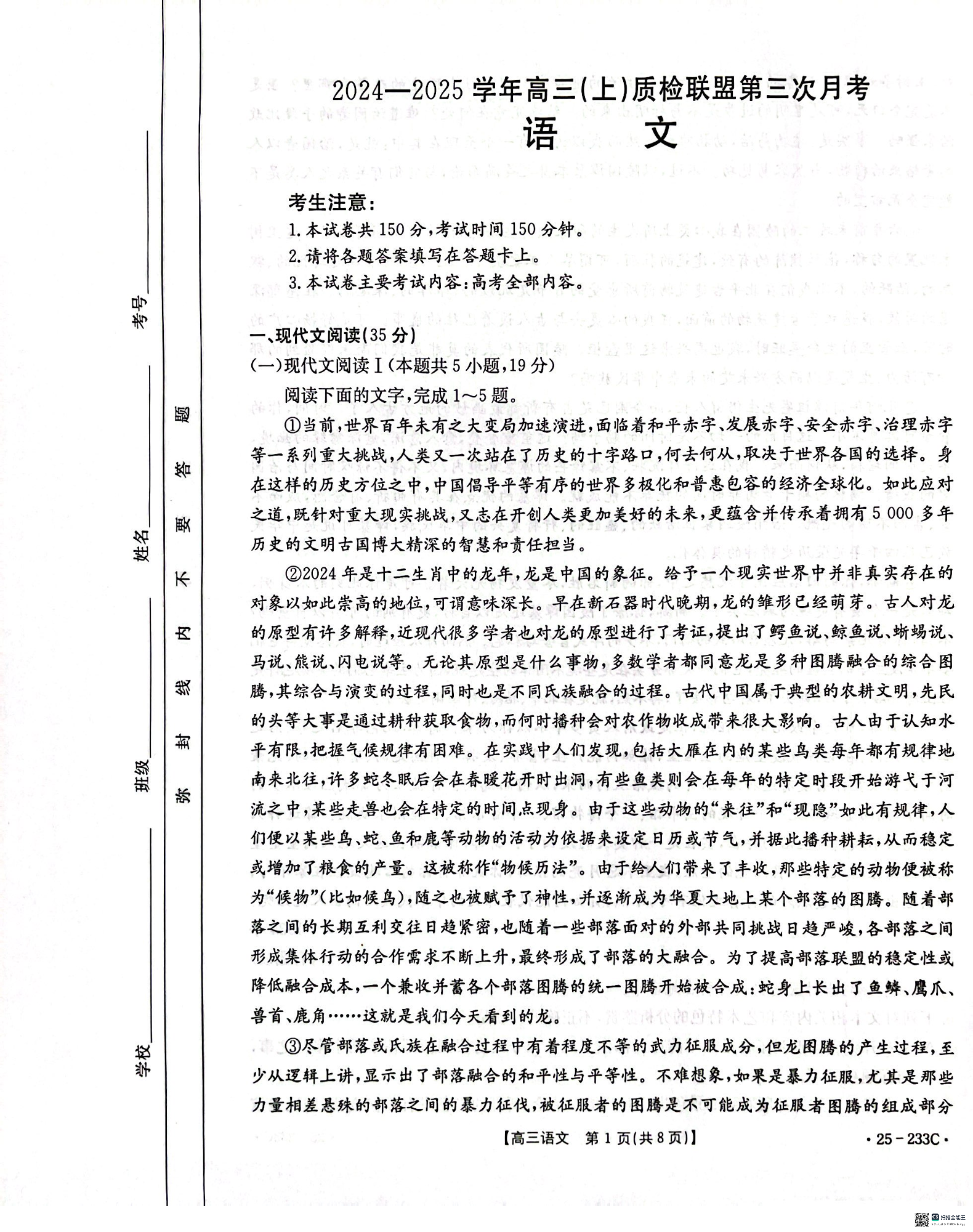 河北省质检联盟2024-2025学年高三上学期第三次月考语文