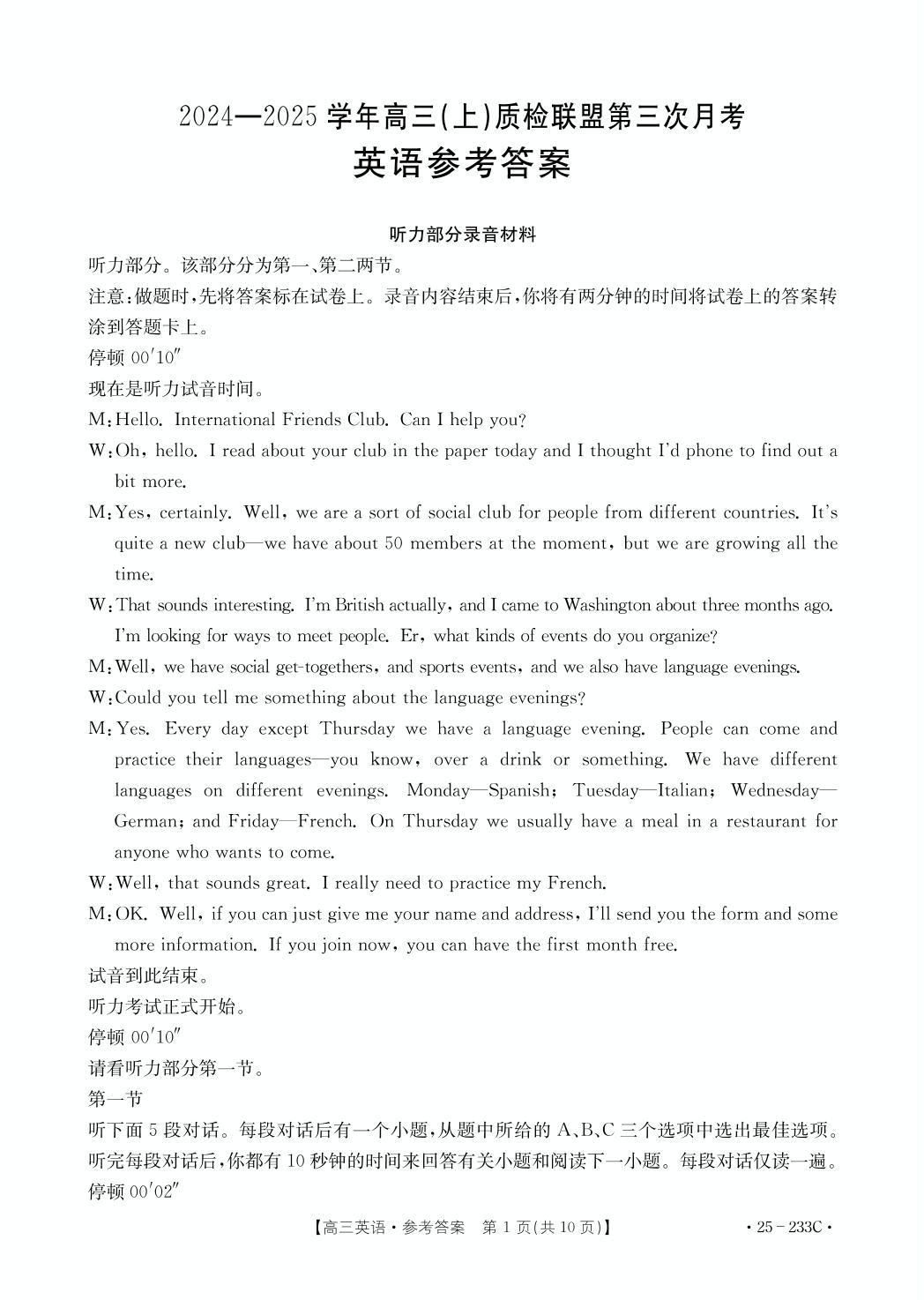 河北省质检联盟2024-2025学年高三上学期第三次月考英语答案
