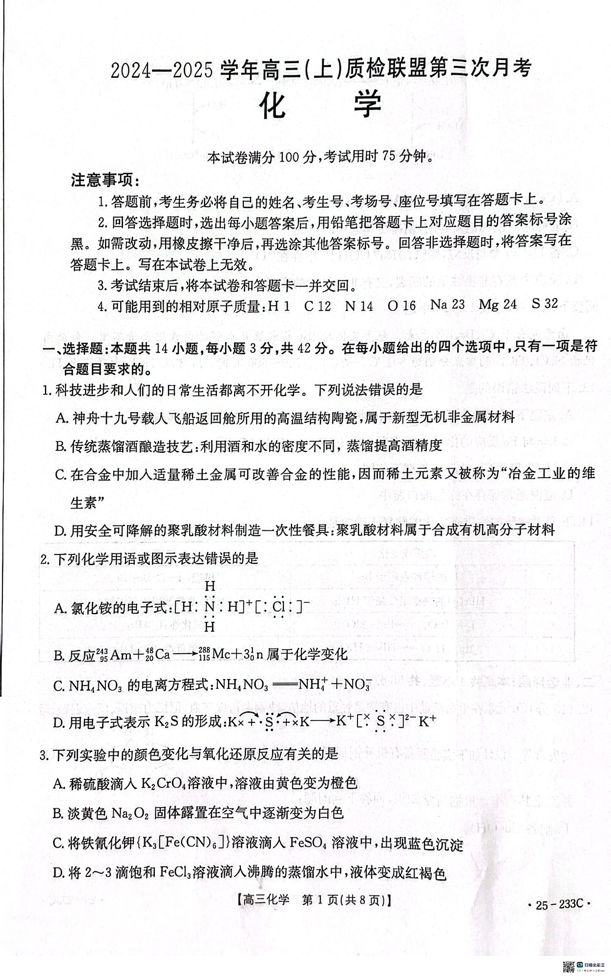 河北省质检联盟2024-2025学年高三上学期第三次月考化学