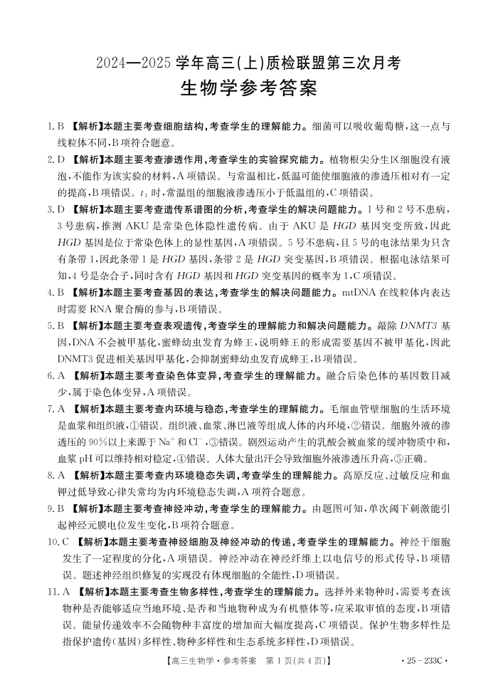 河北省质检联盟2024-2025学年高三上学期第三次月考生物答案