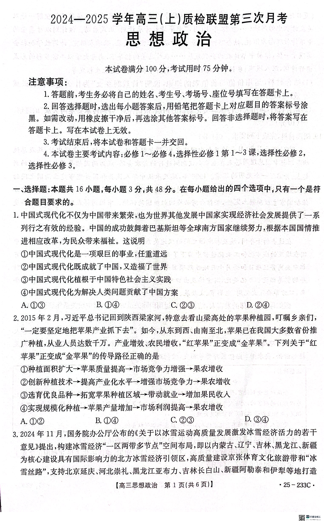 河北省质检联盟2024-2025学年高三上学期第三次月考政治