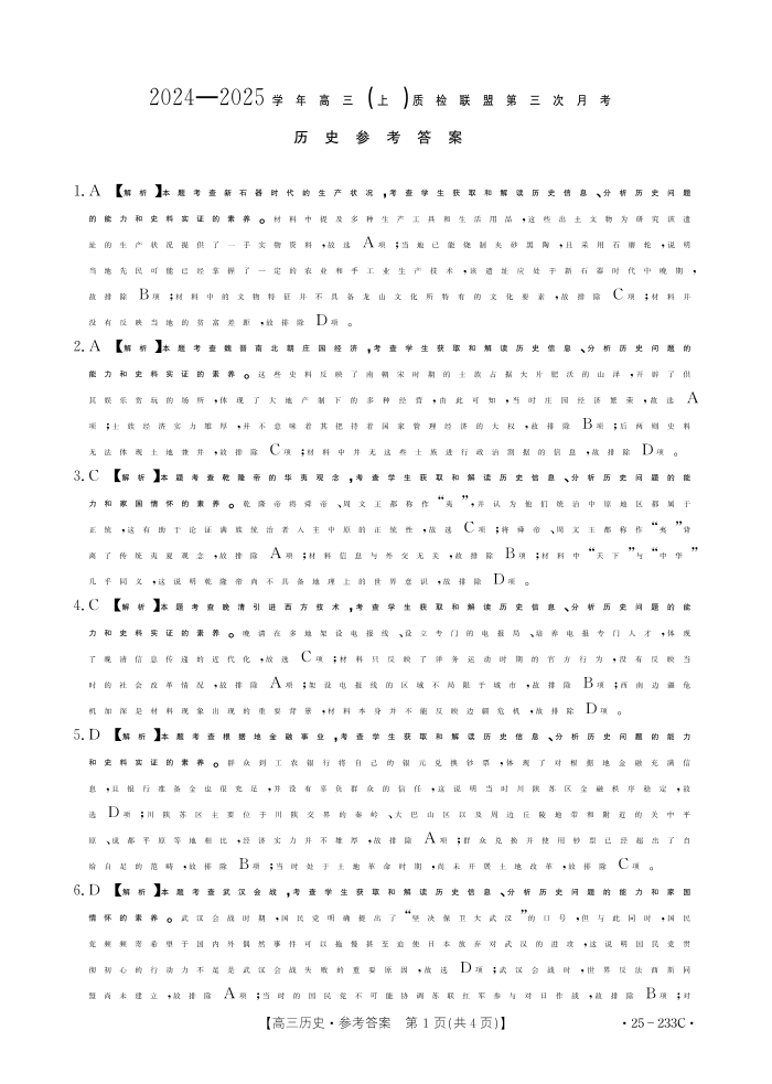 河北省质检联盟2024-2025学年高三上学期第三次月考历史答案