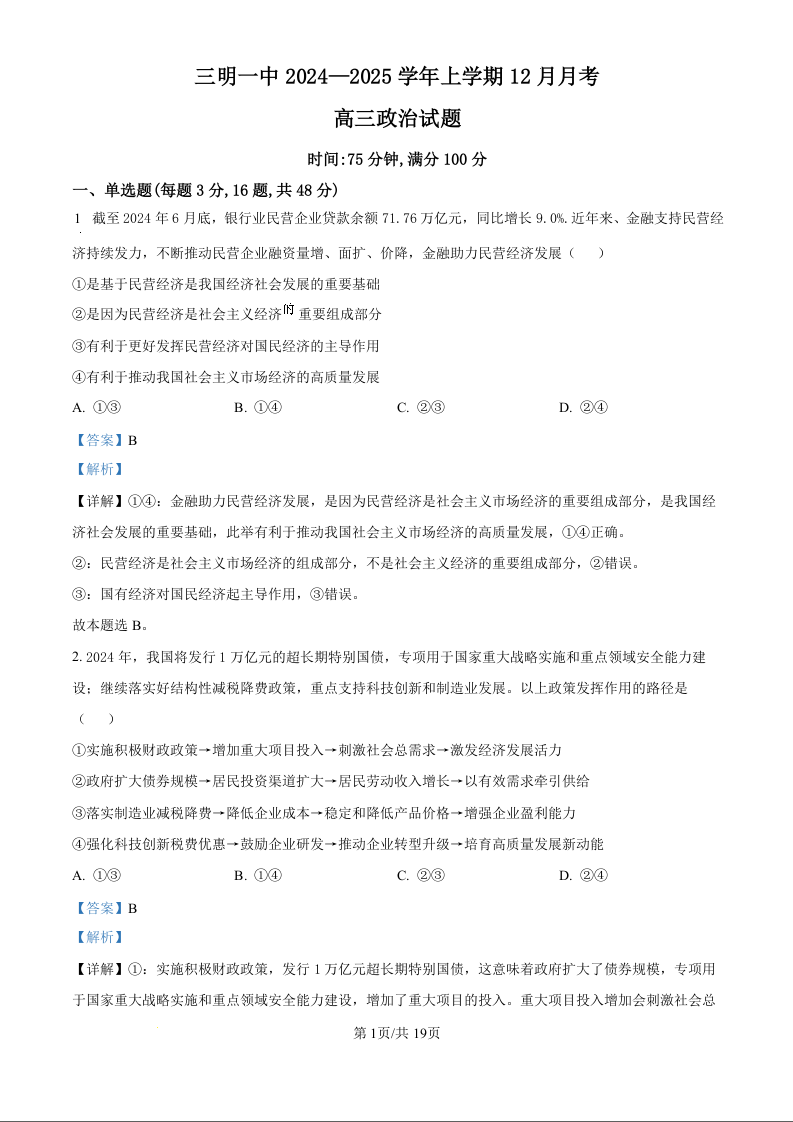 福建省三明市第一中学2025届高三上学期12月月考政治(精品解析版)