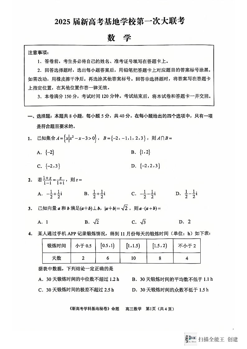 江苏省南通市新高考基地学校2025届高三上学期12月月考数学