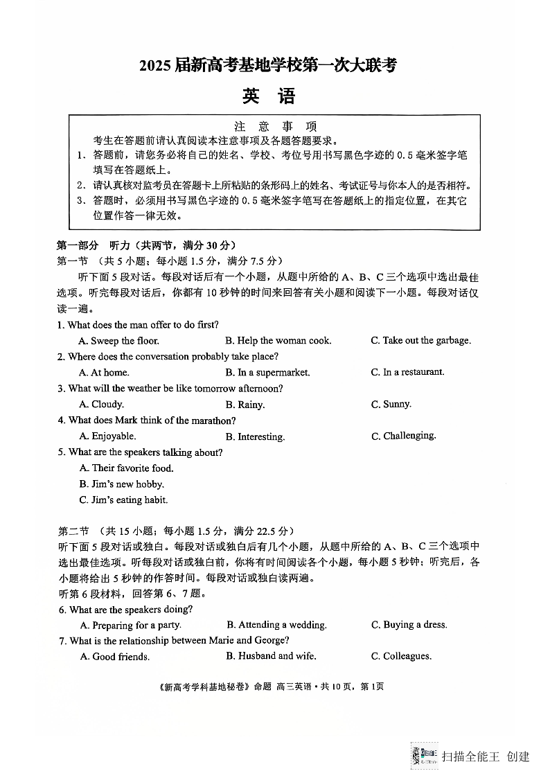 江苏省南通市新高考基地学校2025届高三上学期12月月考英语