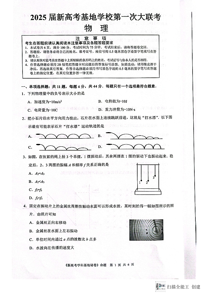 江苏省南通市新高考基地学校2025届高三上学期12月月考物理